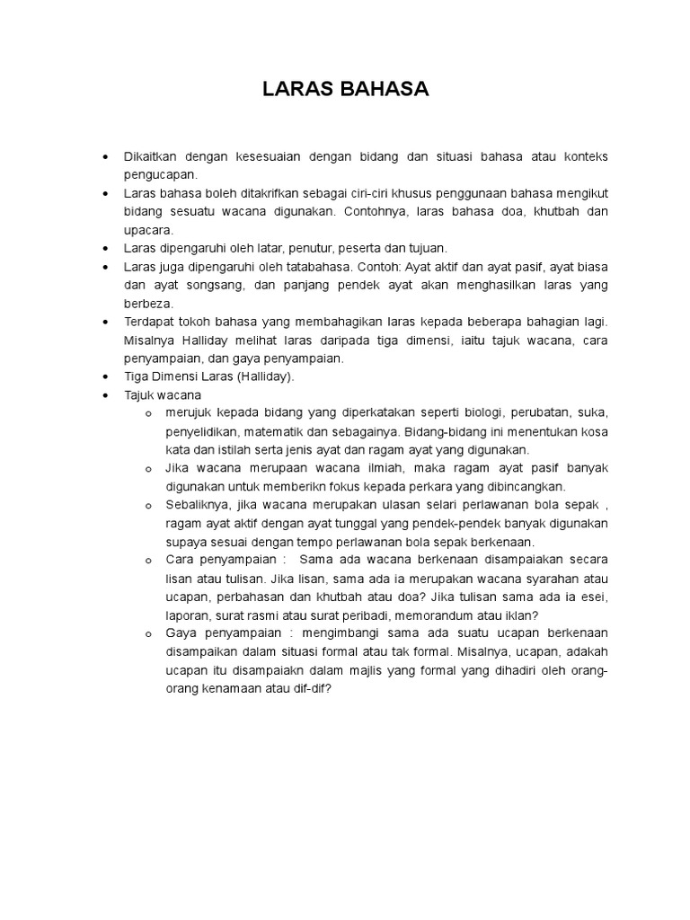 • kosa katanya kurang berbanding dengan kosa kata untuk orang dewasa • bilangan imbuhan yang digunakan terhad, dan imbuhan untuk membentuk kata abstrak tidak terdapat dalam laras ini. • kosa katanya terdiri daripada kata akar, kata nama konkrit, kata kerja dan kata adjektif. Sinar harian edisi kelantan sijil pelajaran malaysia 2016 serbuk mutiara untuk bayi kuning sila buang sampah disini sistem beraja di. Laras bahasa dapat menggambarkan ragam penggunaan bahasa yang pelbagai dan mempunyai ketentuan bidang yang mengkhusus merujuk kepada pemilihan diksi, istilah, frasa dan ayat yang digunakan. Petikan dari gema online journal of language studies volume 7(1) 2007
